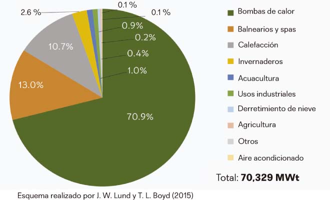 En la figura 5 se presentan las principales aplicaciones directas del calor geotérmico del subsuelo en el mundo. Son datos de 2014, pero, como se aprecia en la gráfica, más de 70 por ciento de tales aplicaciones corresponde a las BCG, siguiéndole los balnearios y spas con fines recreativos o terapéuticos, otros sistemas de calefacción directa que no emplean BCG, los invernaderos con temperatura controlada y los usos industriales.