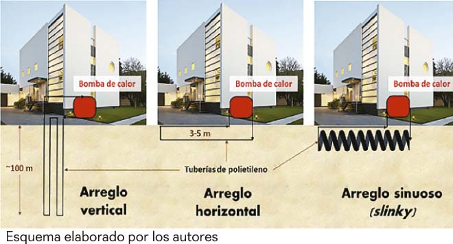 Dependiendo de la disponibilidad de terreno sobre el que se construirá la edificación, el intercambio de calor en el subsuelo se puede realizar mediante sistemas cerrados o abiertos y en configuraciones verticales, horizontales o sinuosas (arreglo slinky), como se esquematiza en la figura 4.